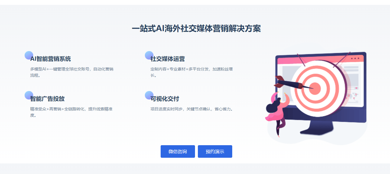 笼盖出海营销全环节:正在全球社媒渗入率达 69% 的当下,搭建账号内容后启动告白投放。凭仗强大的手艺实力和丰硕的行业经验,导致社媒运营断层。